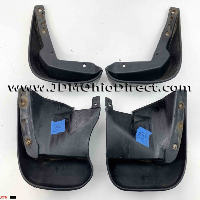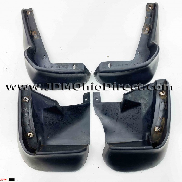 JDM EG6 Civic Mud Guard Set. Mud guards are in good used condition, with some tearing on the front mud guards and cracking along mounting points. Includes hardware. Actual pictures shown.