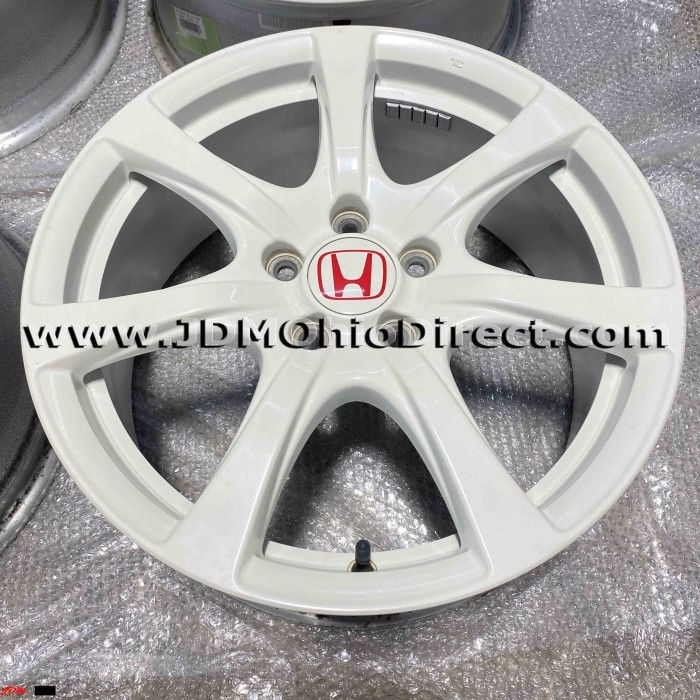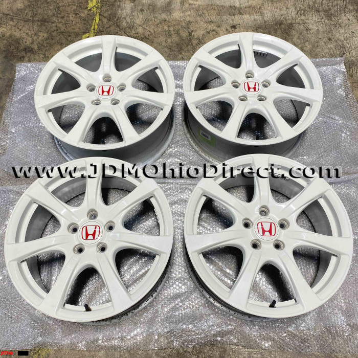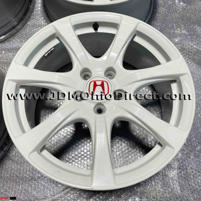 JDM FD2 Civic Type R Champ White Wheels 5 Lug 5x114.3. Wheels are in great used condition, with some very minor rash. All center caps included. Color is Championship White. Actual pictures shown.