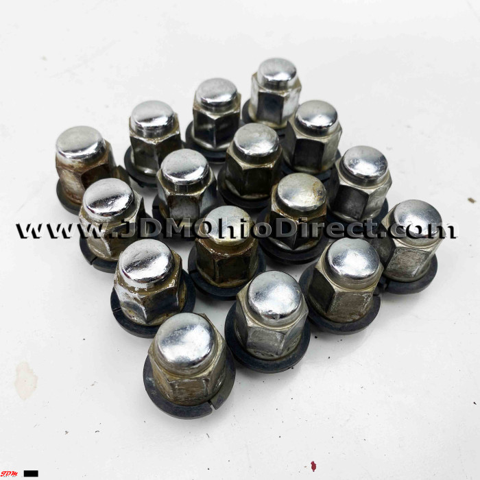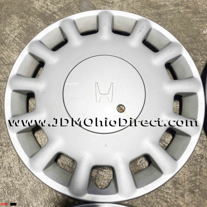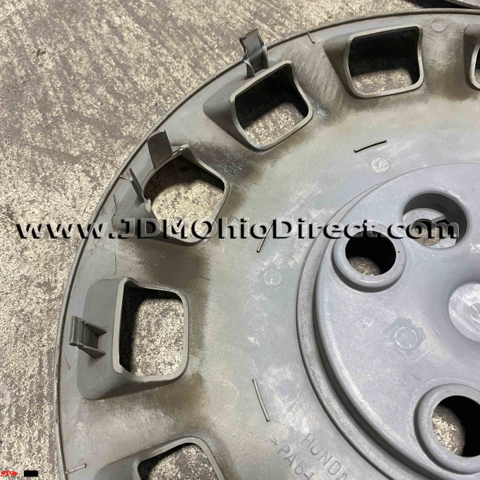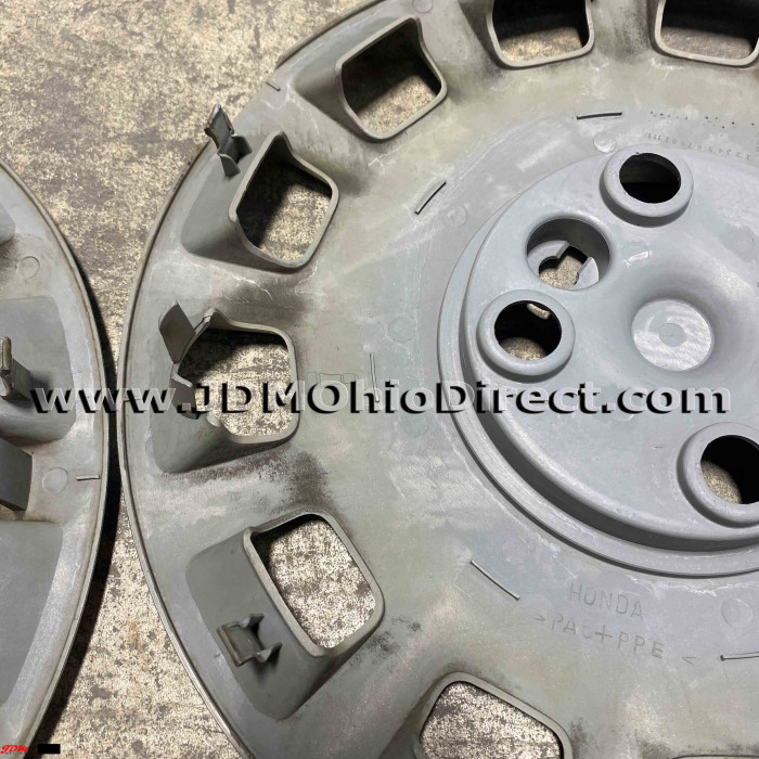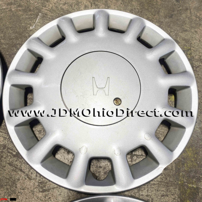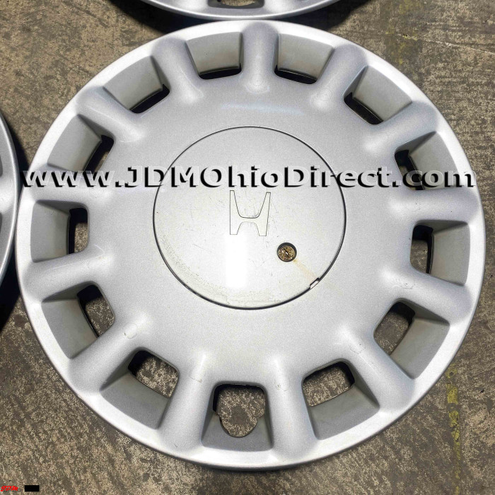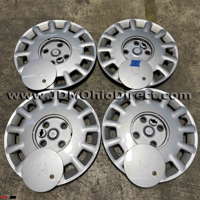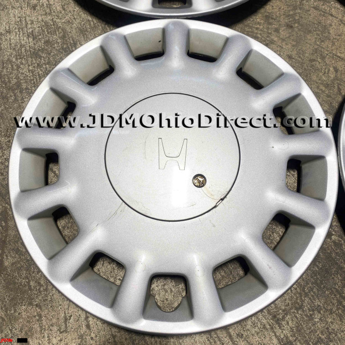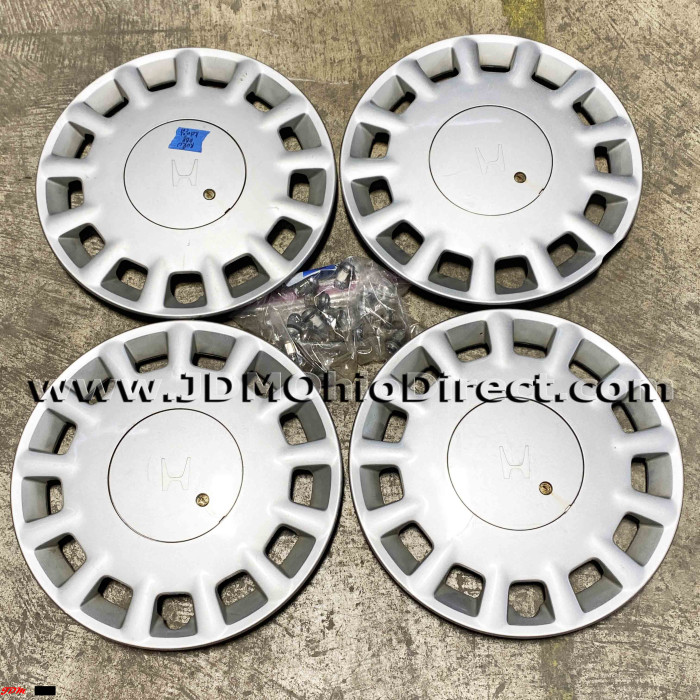 JDM Honda 4x114 15" Hubcap Set. Hubcaps are in good used condition, and include 16pc lug nut set with hubcap rings. Set does have minor flaws with light scratching and 2 out the 4 hubcaps have bent tabs. Actual pictures shown.