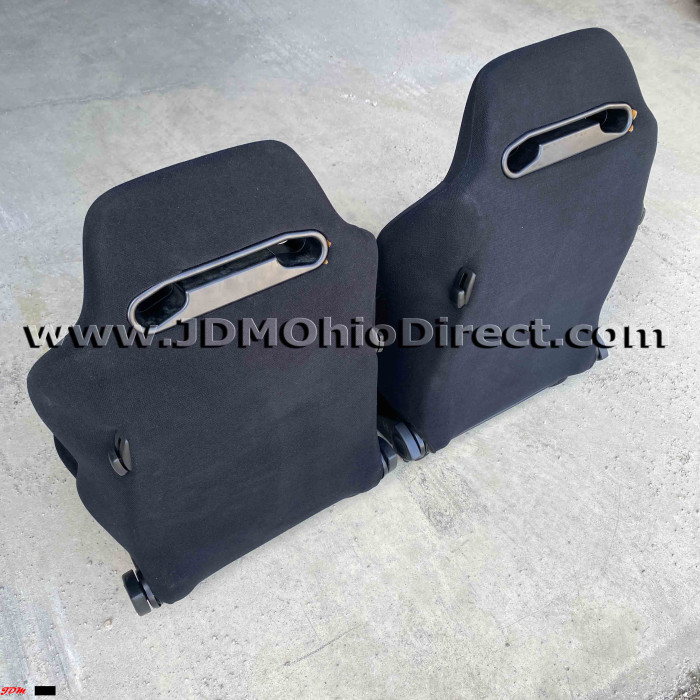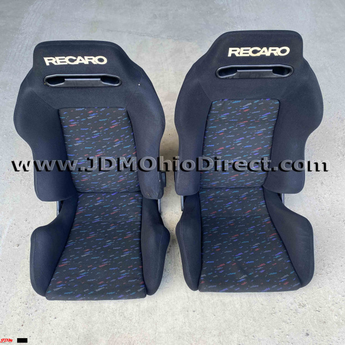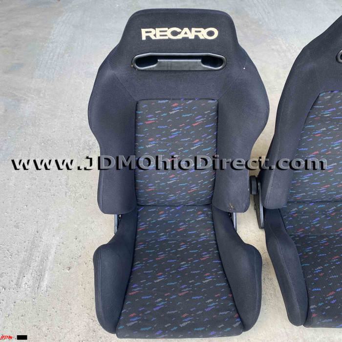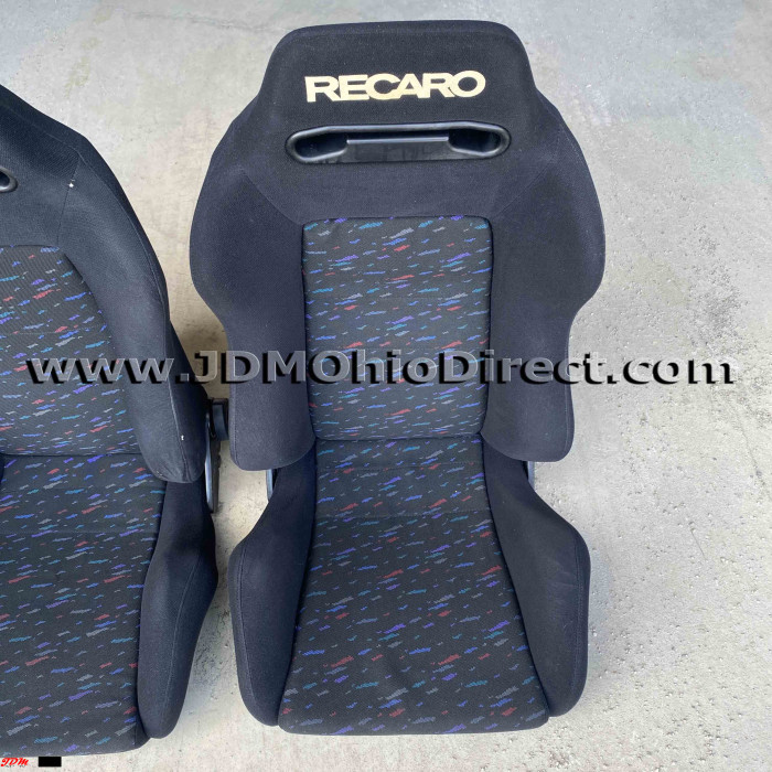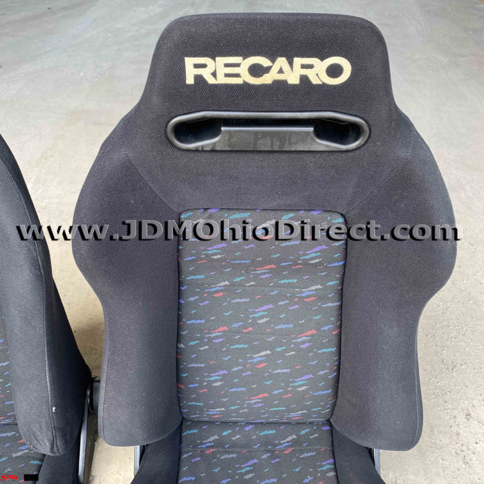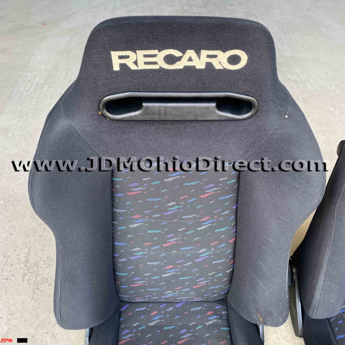 JDM SR3 Recaro LeMans Confetti Seat Set. Seats are in great used condition, with some bolster wear as shown. Color is black with a confetti pattern on centers. Seats have dual twist knob recline adjusters on each seat. Rails Not included. Actual pictures shown.
