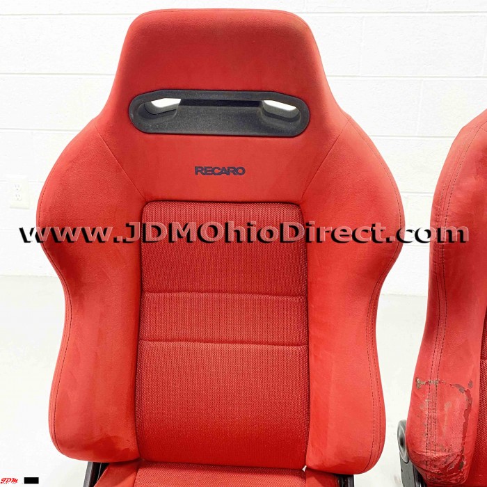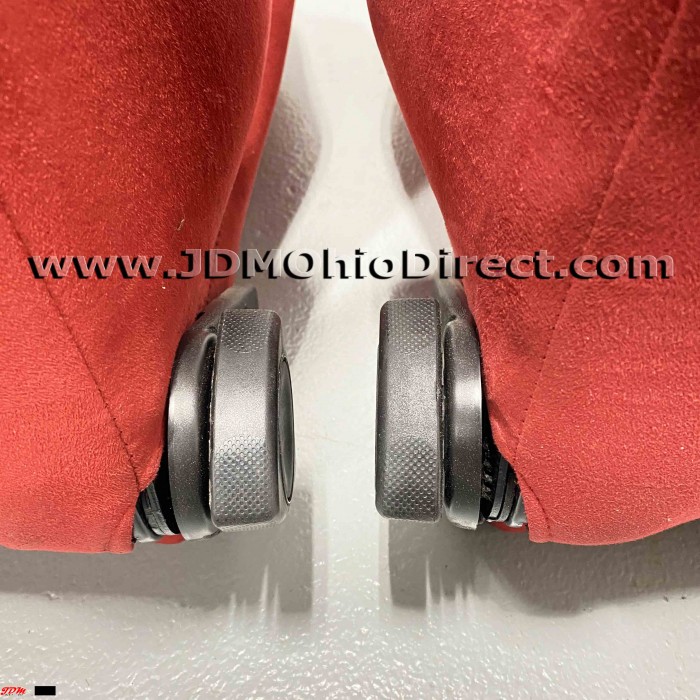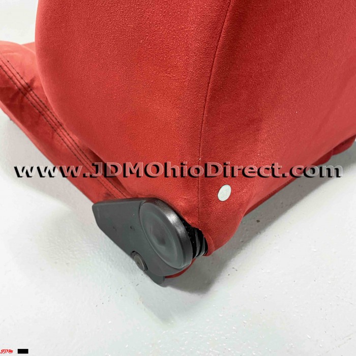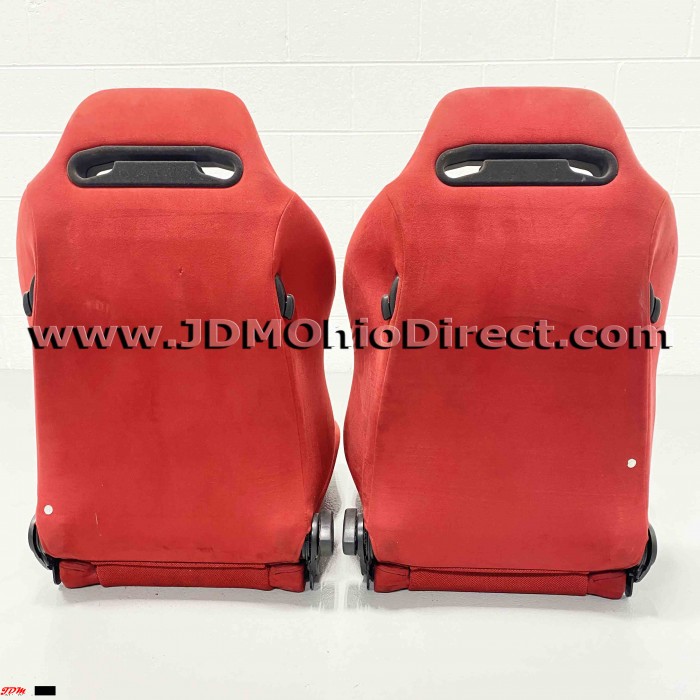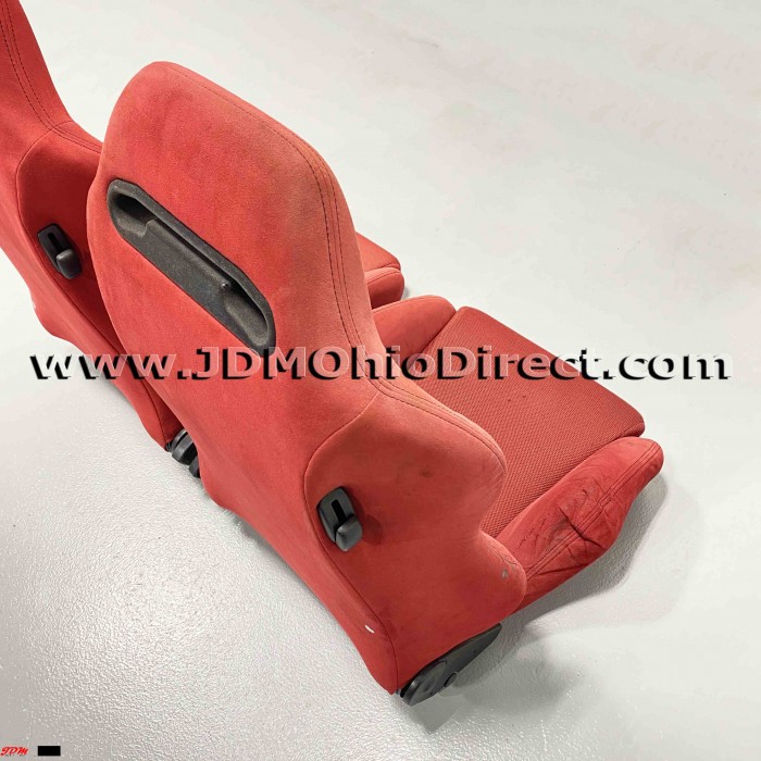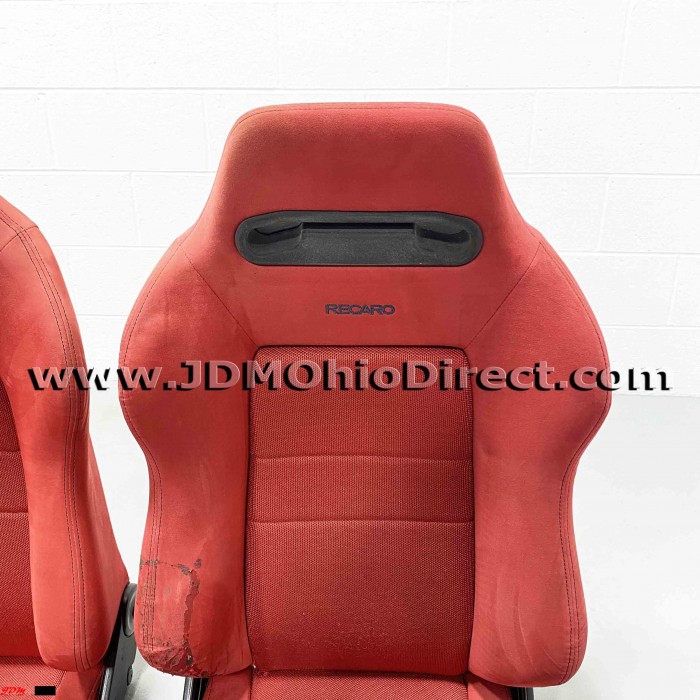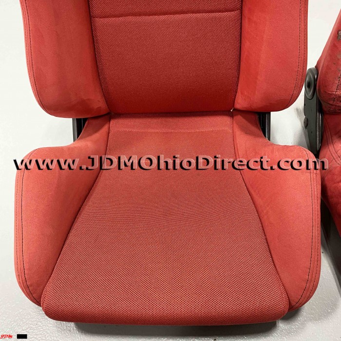 JDM SR3 EK9/DC2 Type R Red Recaro Seats. Seats are in used condition, but do have several flaws as shown. Right seat has bolster wear on outer right side as shown. Left seat has a small tear on the back side, and both seats have a couple minor stains as shown. Seats are not for the picky, but would a great set for track car, daily, or potential rewrap. Material is red suede with black stitching. Seats recline with adjustable twist knob for precise seat angling. Rails Not included. Actual pictures shown.