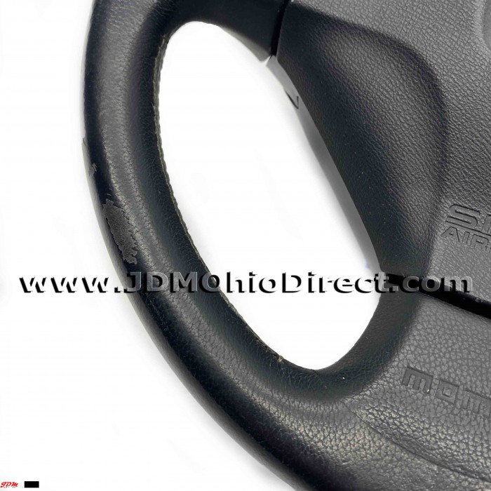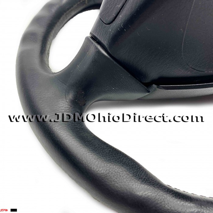 JDM DC5 Integra Type R Steering Wheel. Steering wheel is in good used condition, with only minor wear as shown. Steering wheel has black stitching, found in the Blue DC5R with blue interior. Wheel includes airbag, deployer, and red emblem. Wheel is wrapped in black leather with black stitching. Actual pictures shown.