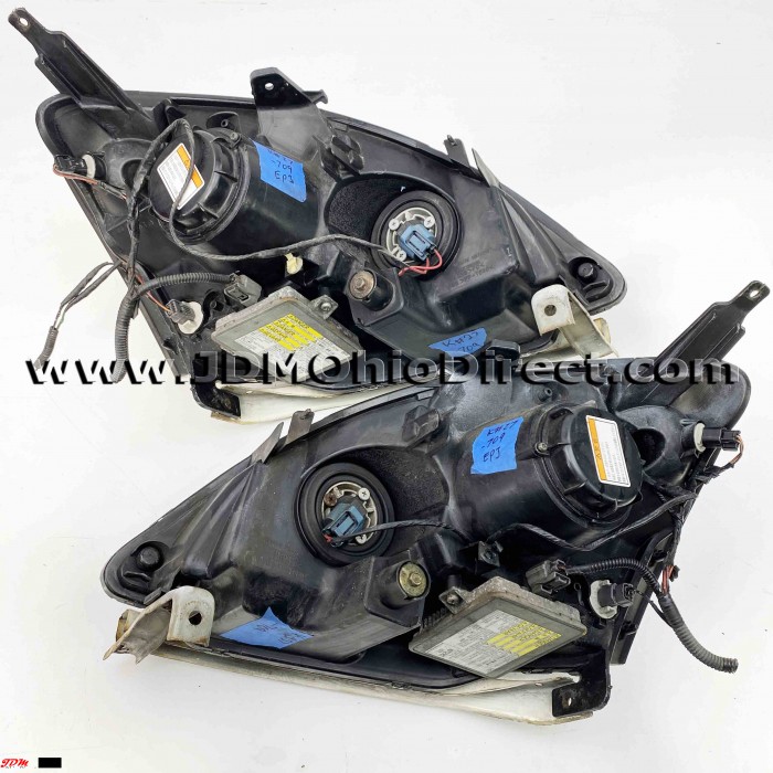 JDM EP3 Civic Type R 04-05 HID Headlight Set. Headlights are in great used condition, with No broken tabs. HID bulbs and ballasts have been tested and working properly. Set includes headlight brackets and pigtails. Actual pictures shown.