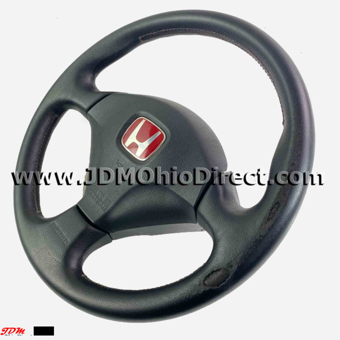 JDM EP3 Civic Type R MOMO Steering Wheel. Steering wheel is in decent used condition, but does have wear holes on right side of wheel. Wheel is wrapped in black leather with red stitching, and red air bag emblem. Airbag inflator has been removed. Actual pictures shown.