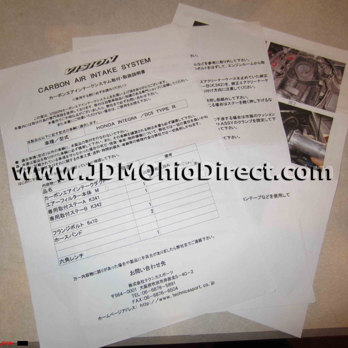 Rare JDM Vision Technica Carbon Fiber Intake kit. Intake and filter are in great condition. Intake will fit in place of stock air-box and connects to OEM intake hose. Will fit most K20 motors. Japanese paperwork included.
