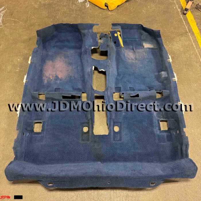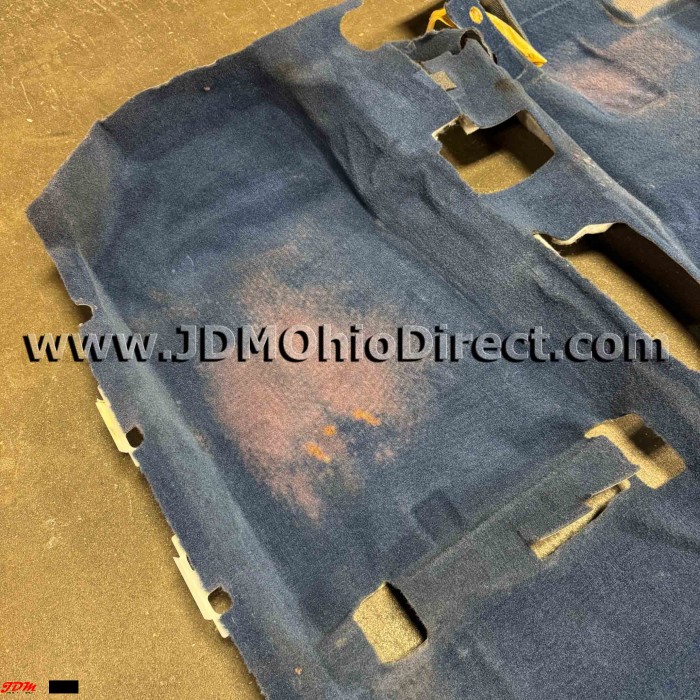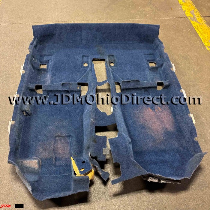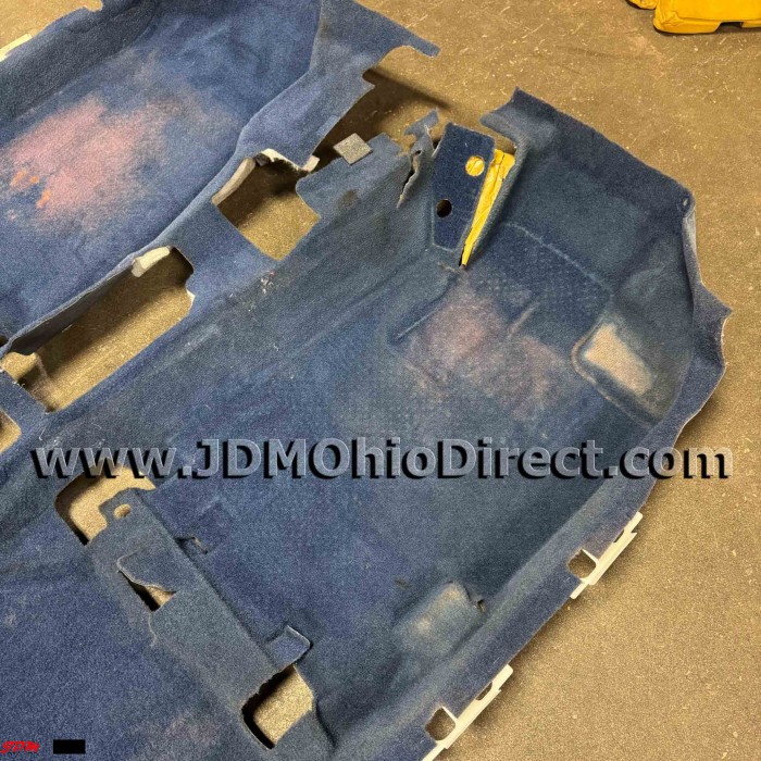 JDM DC5 Integra Type R Right Hand Drive Blue Carpet. Carpet is in good used condition, but does have several flaws as shown. Left side has what appears to be a bleach stain, some wear on driver side, and carpet is cut around dead pedal(Most of these flaws can be covered when floor mats are installed). Actual pictures shown.