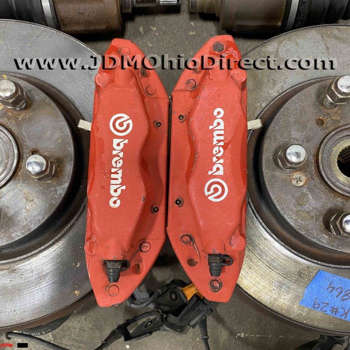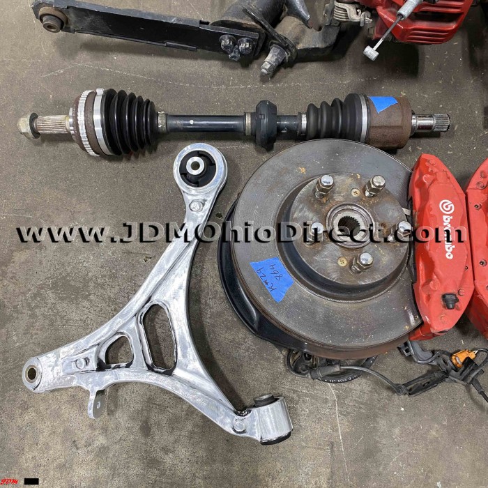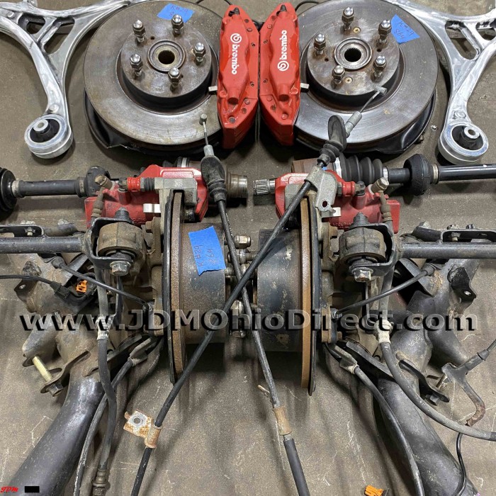 JDM DC5 Integra Type R Brembo Brake Conversion. The set is in great used condition. The JDM DC5 Type R front hubs have a wider stance than the RSX Type S. This requires JDM DC5R axles and lower control arms to be used in combination with the Brembo front calipers and hubs. Lower control arms are aluminum, and much lighter than factory LCAs. Actual pictures shown.