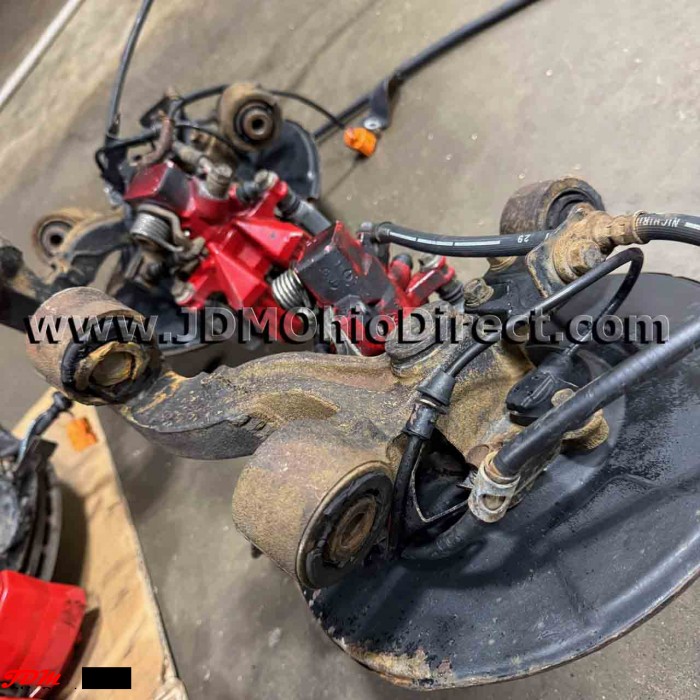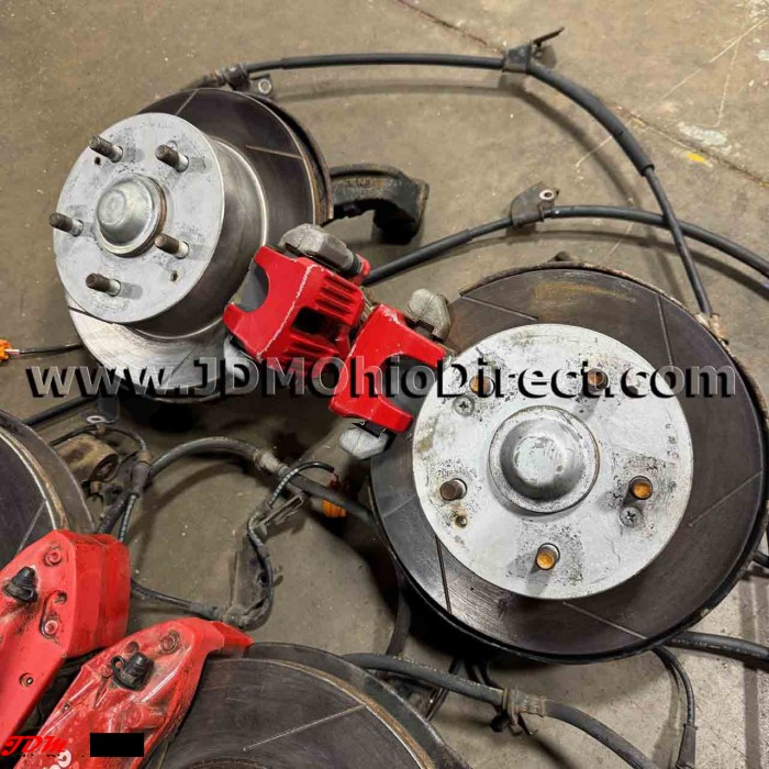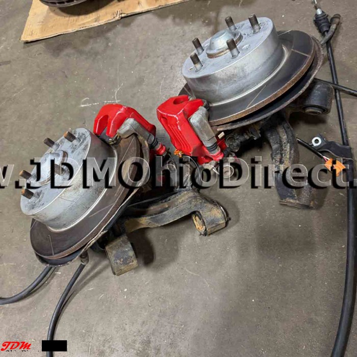 JDM DC5 Integra Type R Brembo Disc Conversion. The set is in good used condition, and includes DIXCEL front and rear slotted rotors. This is not the full Brembo set, missing axles, front LCAs, and No ABS sensors(Removed). Rear Left spindle has a bolt cut and stuck in the bushing, one bushing will need pressed out and replaced. Set Actual pictures shown.