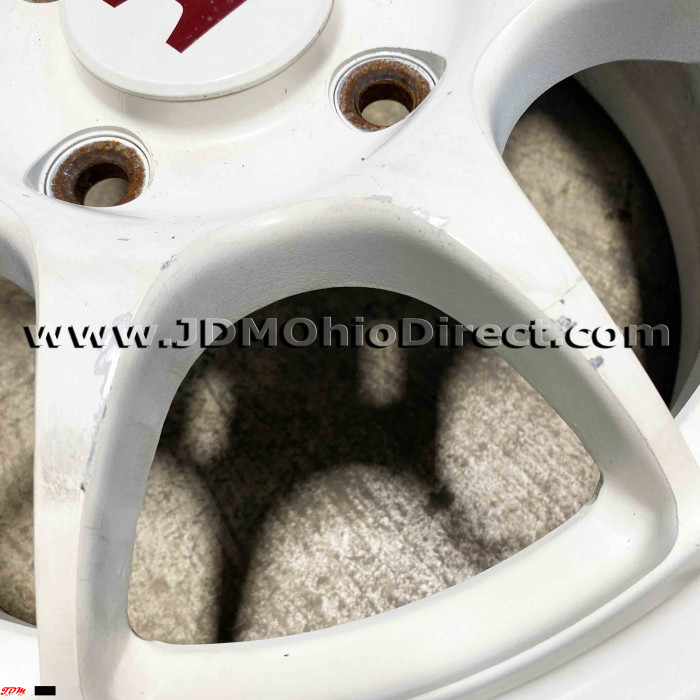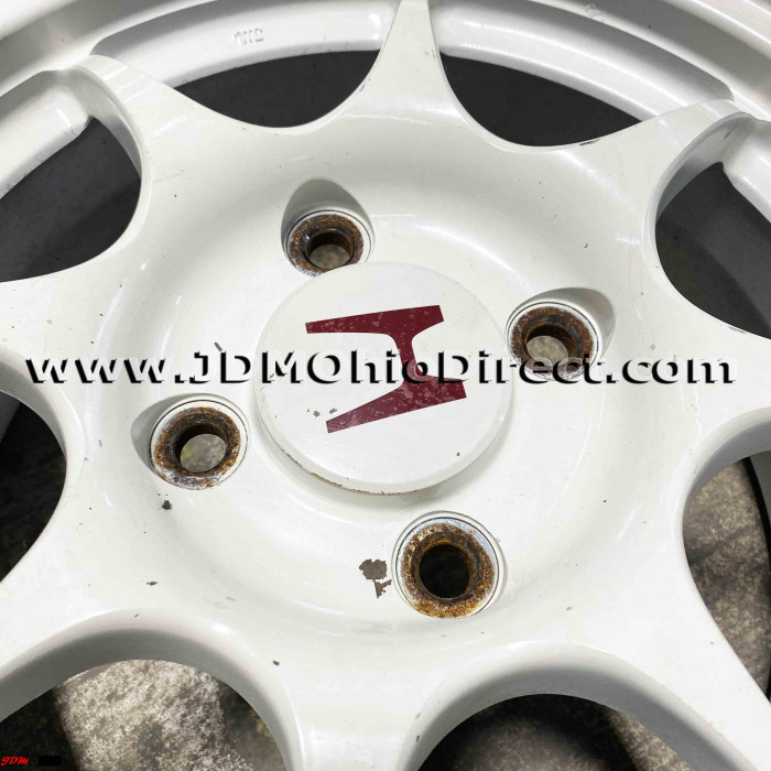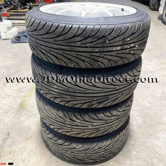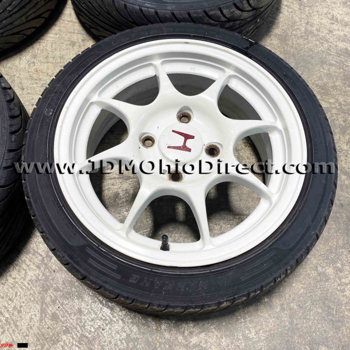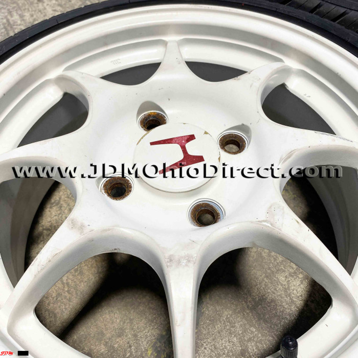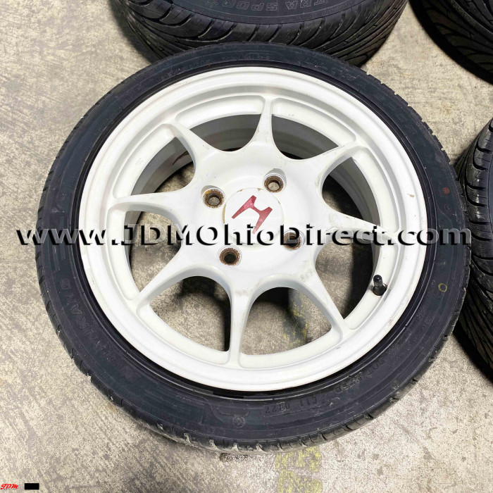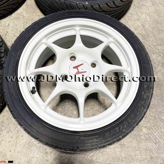 JDM DC2 Integra Type R 96-97spec 4x114 Champ White Wheels and Tires. Wheels are in good used condition, with some paint chipping. Wheels include center caps. Actual pictures shown.