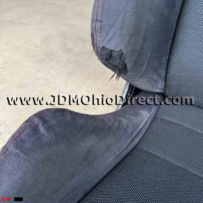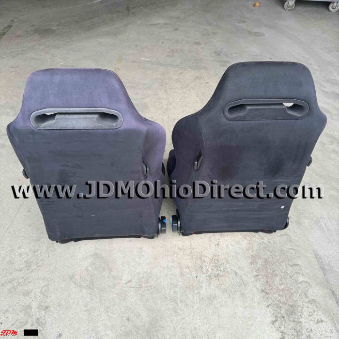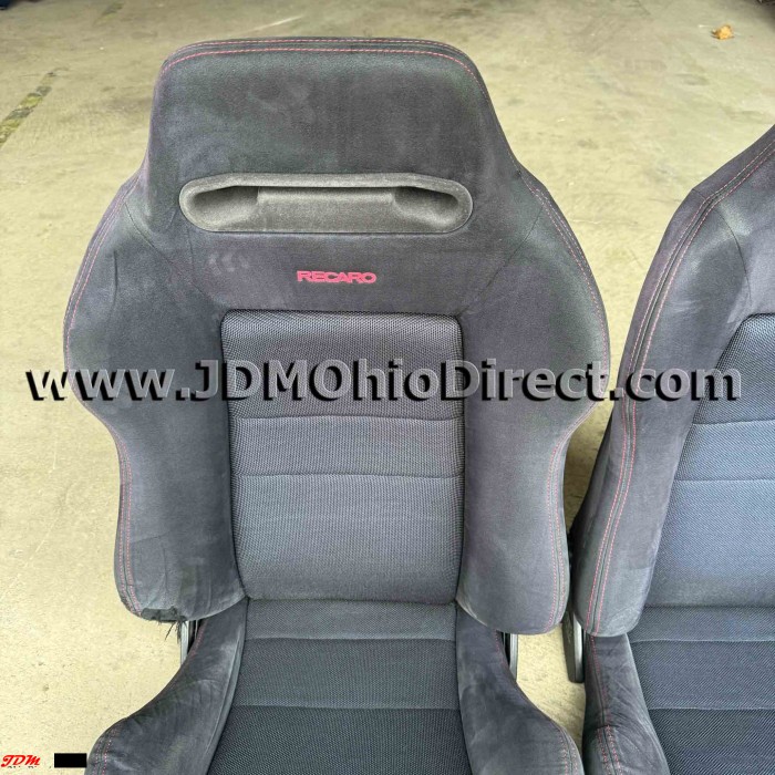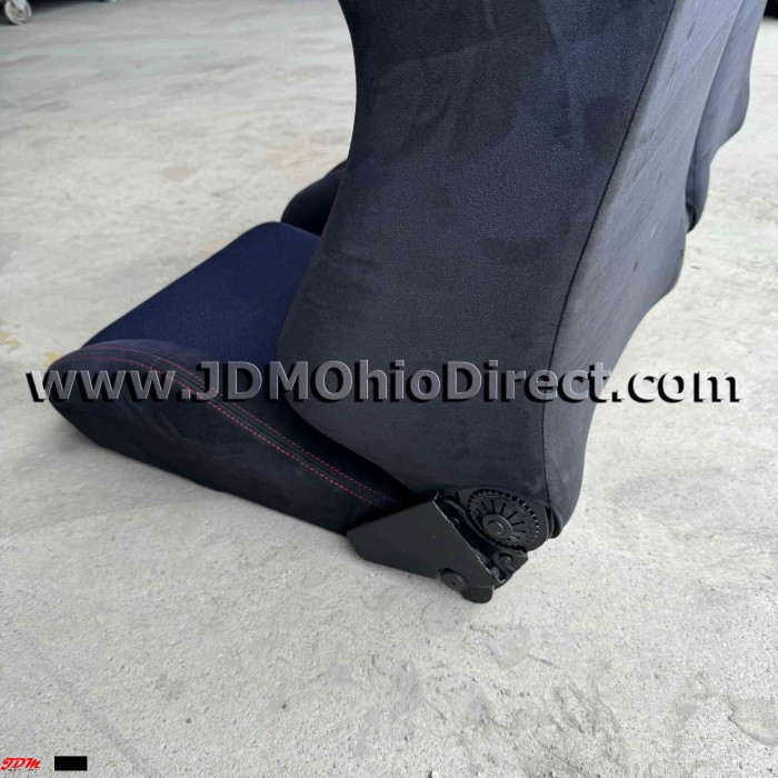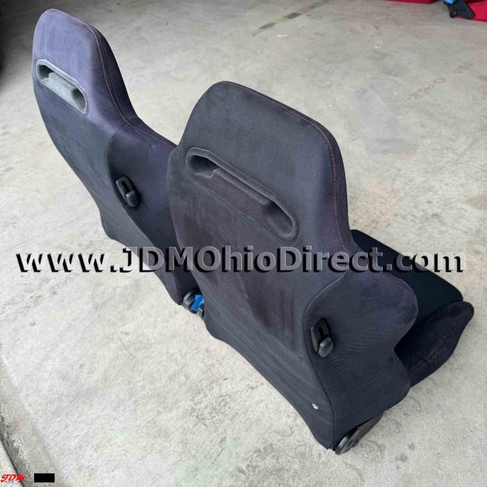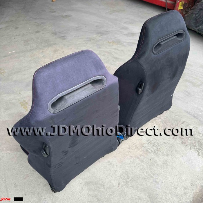 JDM DC2 Integra Type R Black SR3 Recaro Seats. Seats are in good used condition, but do have some flaws as shown. Right outer bolster wear on both seats, and Left seat has a broken side cover as shown. Seats do Not include seat rails. Material is black suede with red stitching. Seats recline with adjustable twist knob for precise seat angling. Actual pictures shown.