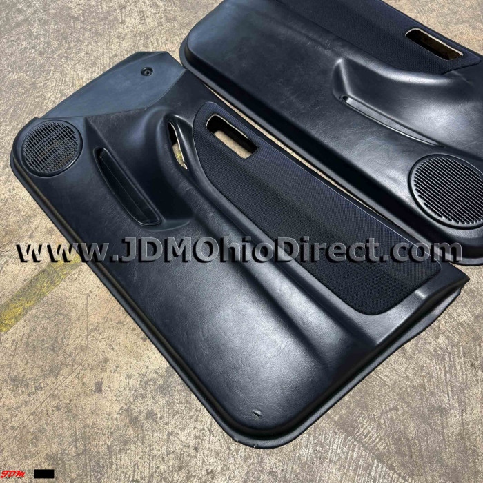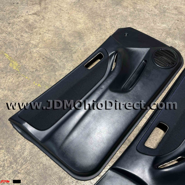 JDM DC2 Integra Type R Door Panels. Door panels are in great used condition, with several minor flaws. Right panel has damage in the lower corner, and left panel has minor peeling in the armrest corner. Overall, great used condition. Panels include speaker grills. Door insert material is black tweed, which matches black Recaro Type R seats. Actual pictures shown.