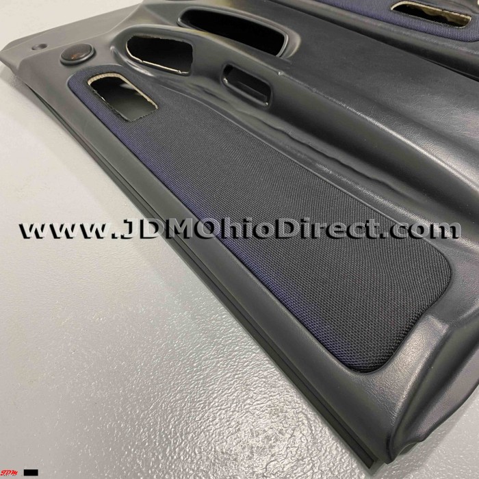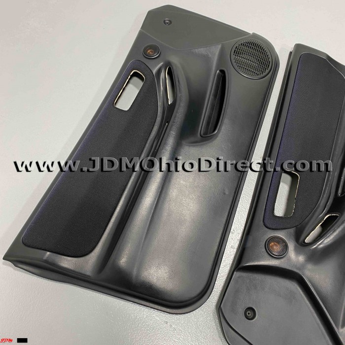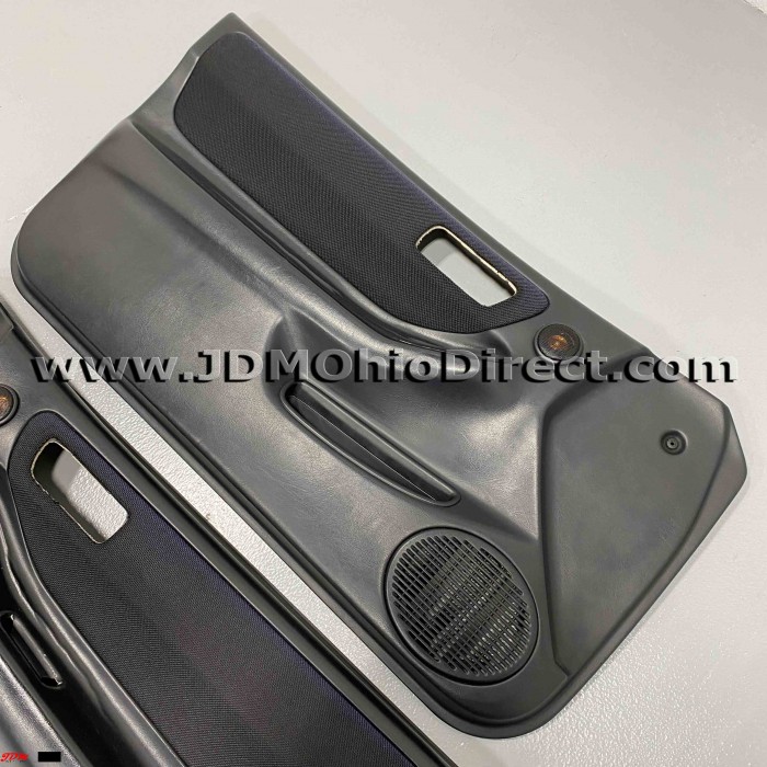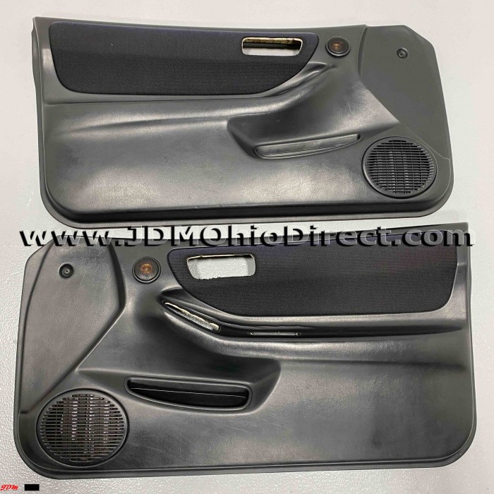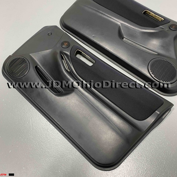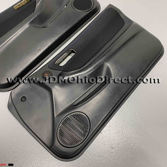 JDM DC2 Integra Type Rx Door Panels. Door panels are in used condition, with several flaws as shown. Rx panels have oem tweeters compared to standard Type R panels. Left panel has a small indentation mark on bottom section, and some peeling in armrest corner. Right panel has some peeling in the armrest corner, and both have some minor sun fade. Panels include speaker grills and aftermarket tweeters(inside oem tweeter housing). Door insert material is black tweed, which matches black Recaro Type R seats. Actual pictures shown.