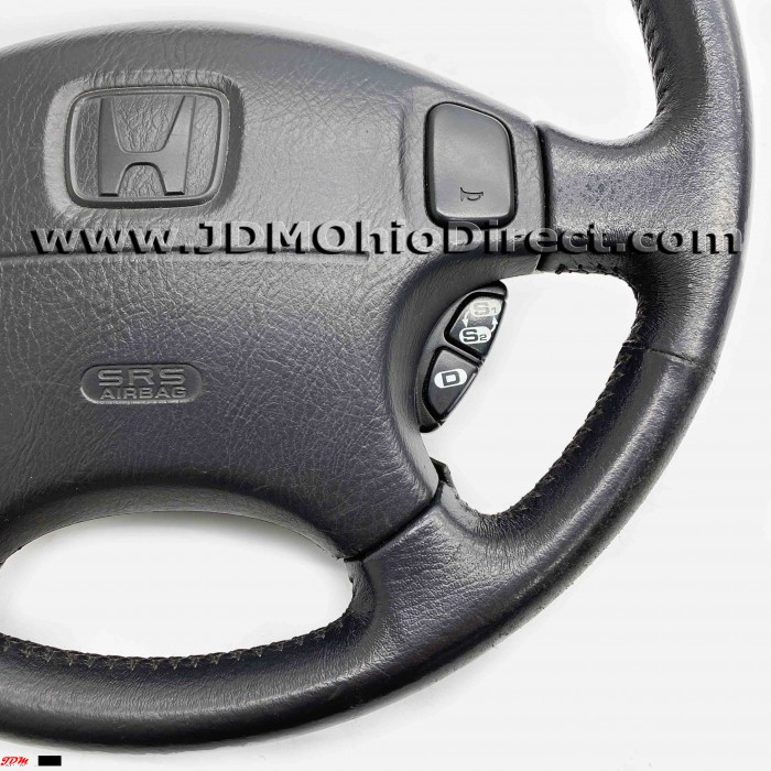 JDM EK3 Civic ViRS Black Leather Steering Wheel. Steering wheel is in great used condition, with no rips, or tears. Steering wheel is leather, and black in color. S1, S2, and D buttons on wheel are for auto transmission driving setting(D15B 3-Stage), but can be swapped for USDM cruise control. Steering wheel includes deployer. Actual pictures shown.