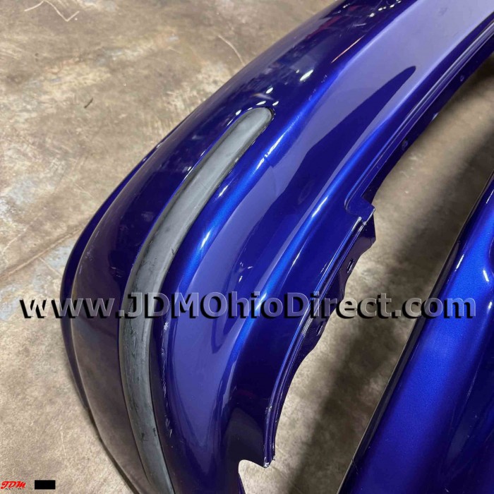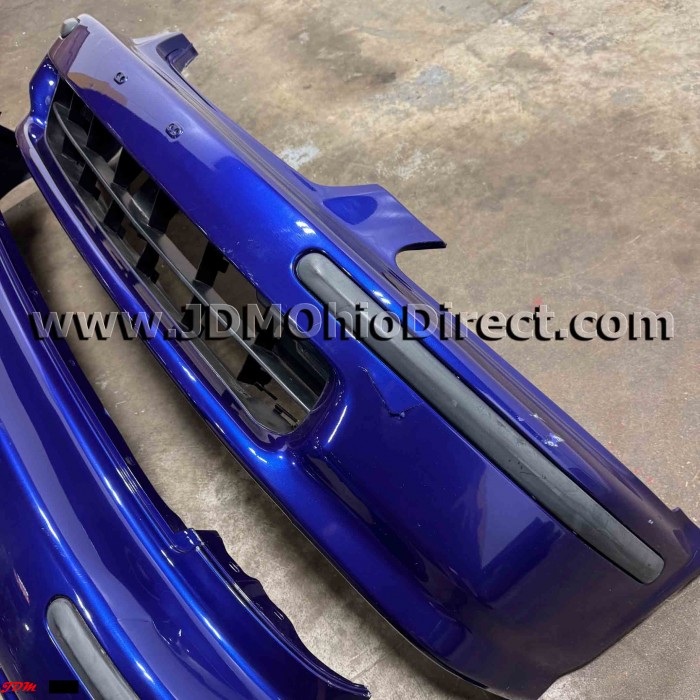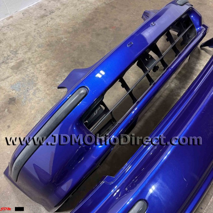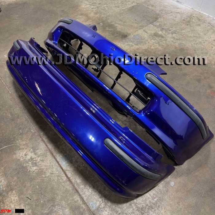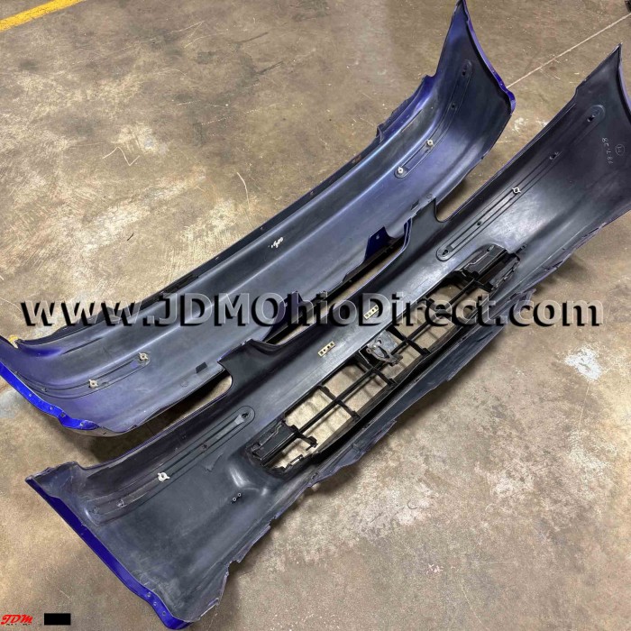 JDM EK4 Civic SiR Front and Rear Bumper Set. Bumpers are in good used condition, but do have some flaws as shown. Front bumper has a damaged bumper tab, impact cut on the front, and several damaged fins on center grill. Rear bumper has several minor indentations as shown. Actual pictures shown.