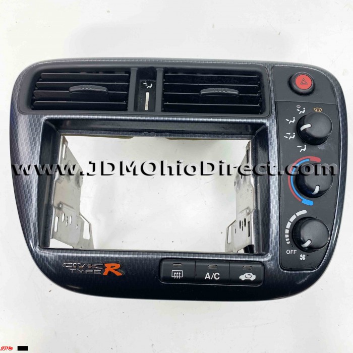 JDM EK9 Civic Type Rx 2000spec Blue Climate Bezel. Climate bezel is in great used condition, with one missing tab (Will still mount solid no problem). Bezel lights up amber, and features the 00spec Gloss Blue Carbon bezel. The blue bezel was only offered on the 2000 Rx model. Climate bezel is designed for RHD specific vehicles. It can be used on LHD, but will require trimming dash air ducts to accommodate offset climate vents. Actual pictures shown.
