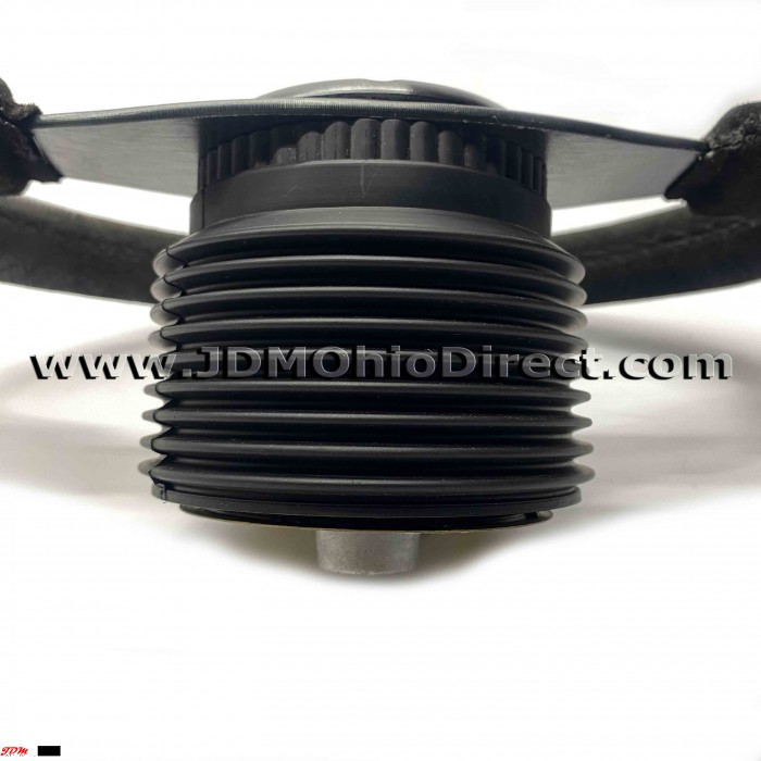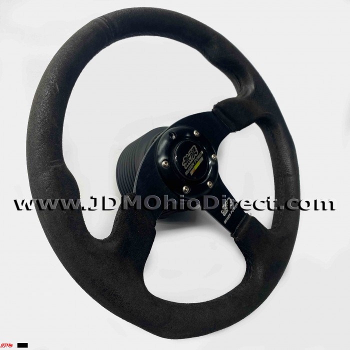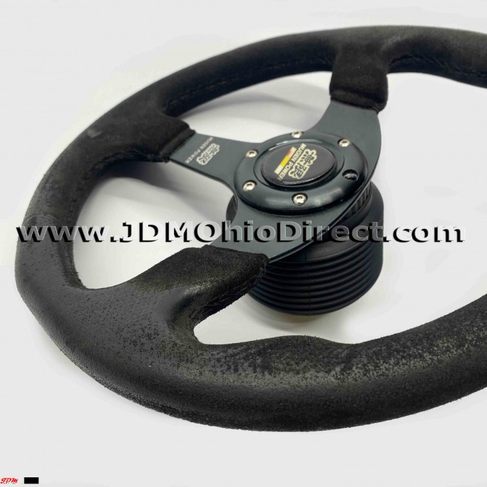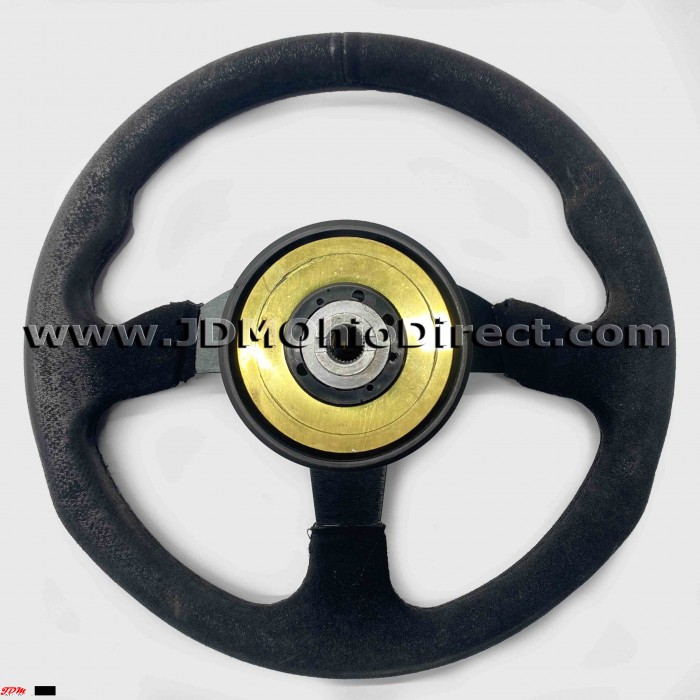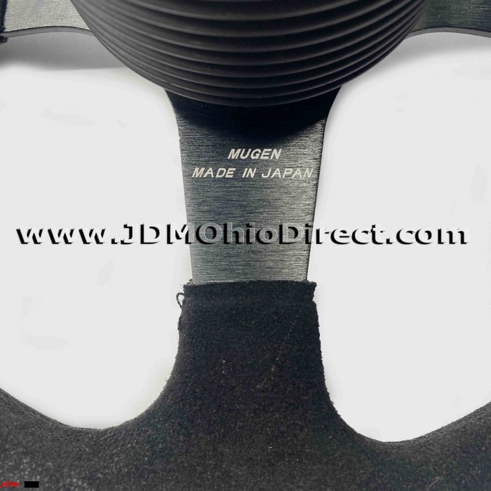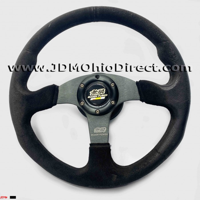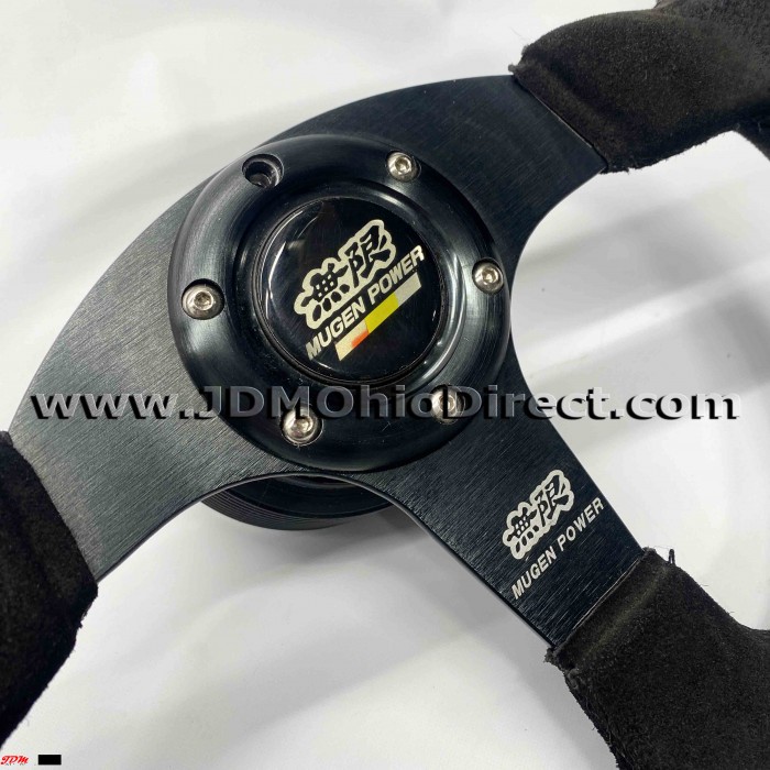 JDM Mugen Style 350mm Suede Black Stitch Racing Steering Wheel With DC2 Hub. Wheel is in used condition with some suede wear as shown. DC2 wheel hub is for Non-SRS, and wheel is not authentic Mugen. Beauty ring is missing one bolt and the horn button does have fade. Actual pictures shown.
