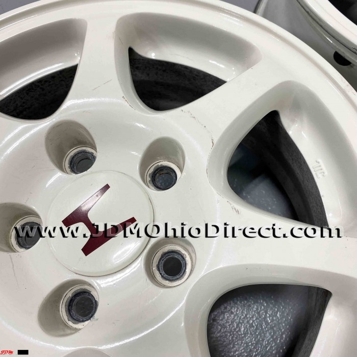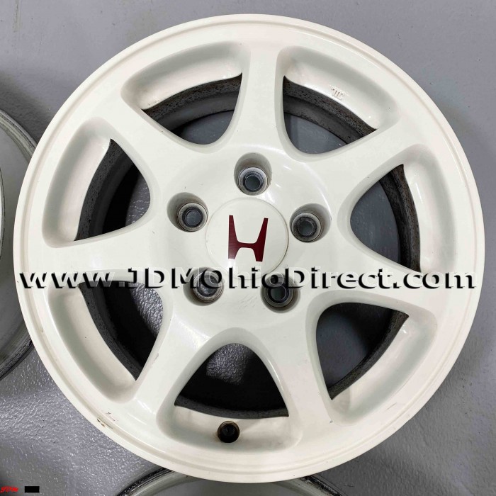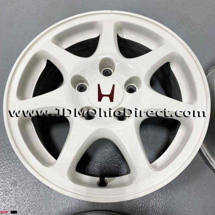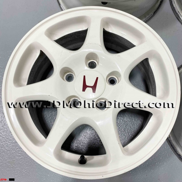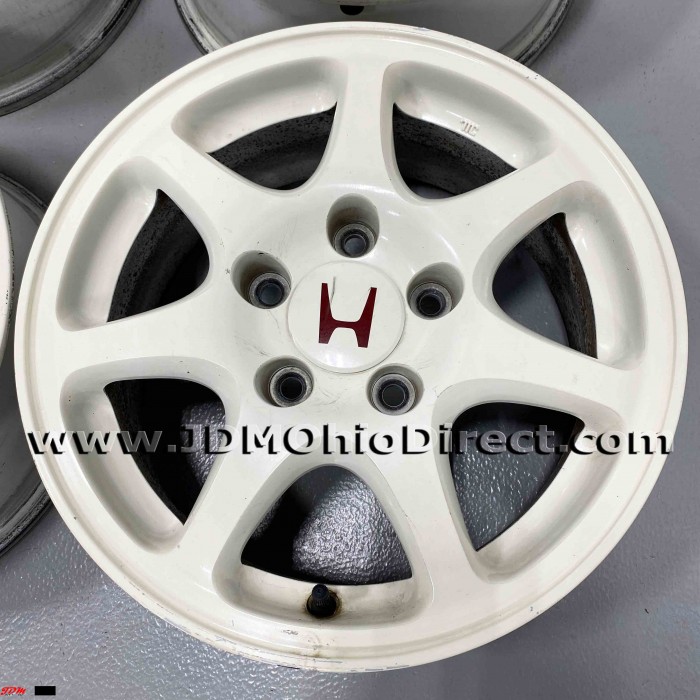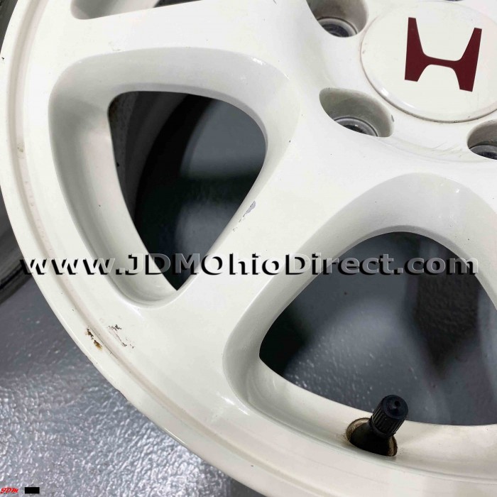 JDM EK9 Civic Type R White 5 Lug Wheels. Wheels are in great used condition, with a couple small chips as shown. Includes caps. Actual pictures shown.